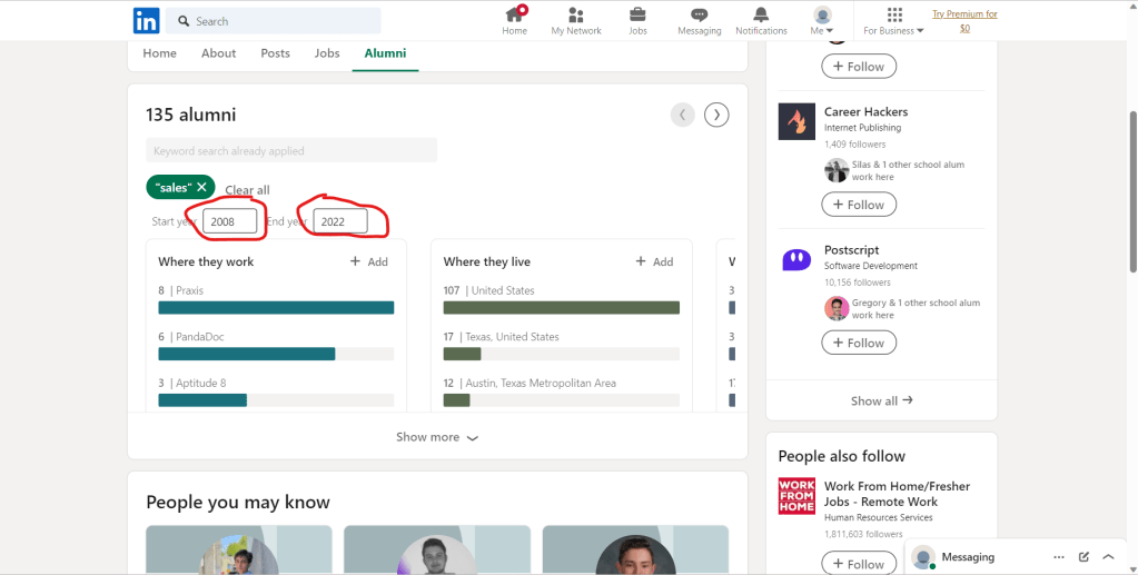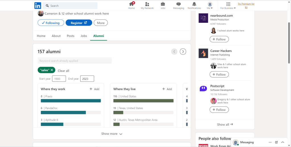 A good place to start for my application was to search the Praxis alumni page. I thought it would yield the best results for people who would be responsive to my emails and willing to talk to me. However, you could change your search pool depending on your application. Examples of other initially limiting pools would be a specific location or simply based on what a company specializes in. I decided to focus my search on people who are working in a sales role who had graduated from Praxis.