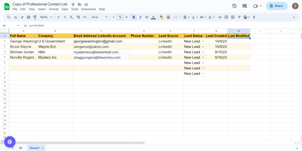 The google spreadsheet I created is just a simple method of keeping track of my leads and what stage of contact I am in with them. If you’d like to check it out, I’ve made a copy of it you can access here. I have obviously used fictitious names in my example and copy spreadsheet.
