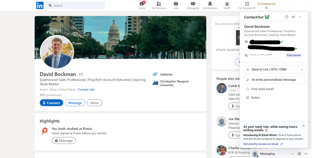 At this point, my selected candidate pool was small and specific enough that I was ready to start adding them to my spreadsheet. However, LinkedIn does not offer people’s email addresses. My only option would be to either contact them through LinkedIn’s messaging system or find their email addresses somehow. This brought me to ContactOut which is a program that searches the internet for the person the LinkedIn profile belongs to and finds email addresses associated with them. It is simple to use. It’s a chrome extension so you just sign up, download it, and your good to go.