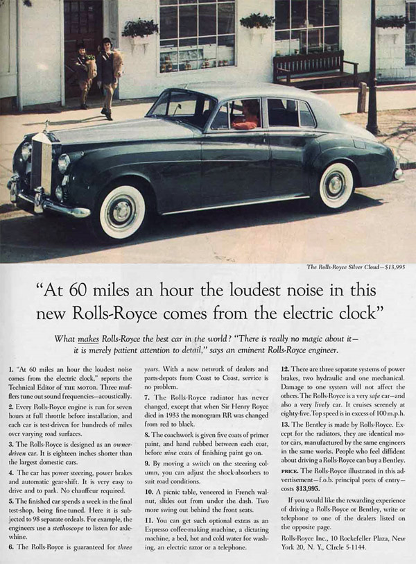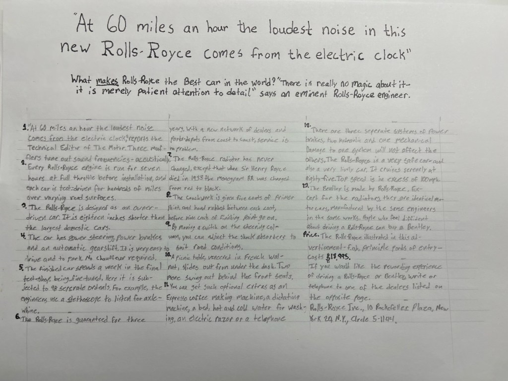 With that in mind, one project I did was to take a classic example of well written copy, this Rolls-Royce ad from 1959, and I copied it word for word by hand. Taking special care to try to make it look exactly like it did in the original. I paid close attention to the author’s word choices, any psychological triggers that may be present, and the word emphasis throughout the ad. Really studying this great ad gave me a great foundation for later projects.