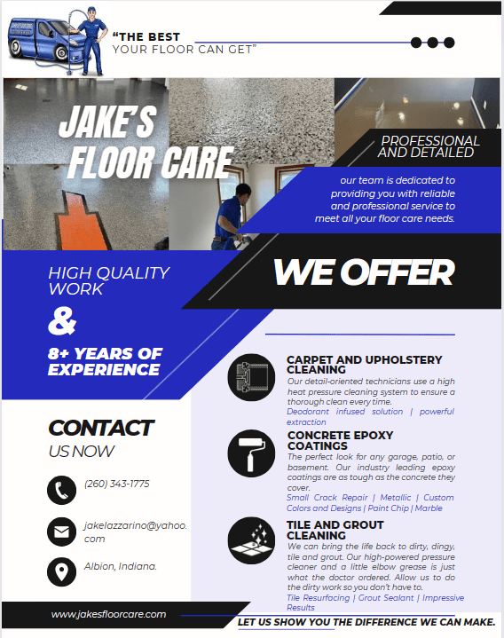 I chose my current employer as the subject business and got to work. Using Canva to create a layout and my new copywriting skills, I was able to create this flyer Ad for Jake’s Floor Care.
